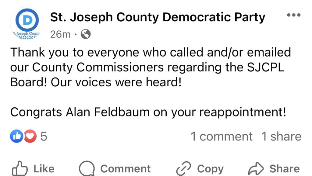 “Thank you to everyone who called and/or emailed our County Commissioners regarding the SJCPL Board! Our voices were heard!” A post on the SJC Democrat Party Facebook page reads.