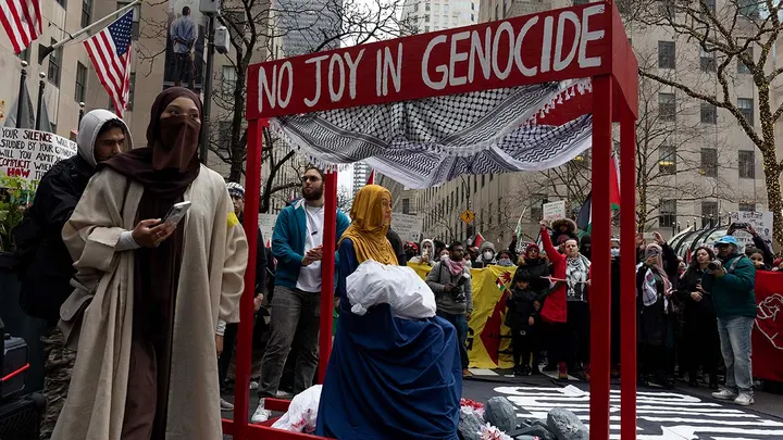 NEW YORK, New York — While the St. Joseph County Democrat Party promotes a Satanic holiday display put up by supporters of the terror group Hamas in the County-City Building in Downtown South Bend, party allies took to the streets of New York City with a “blood” splattered nativity scene in an attempt to “cancel Christmas.” New York Police Officers arrested several of the rioters as they became violent in the iconic Rockefeller Center. The rioters also carried pro-Palestinian/Hamas flags and signs that read “while ur shopping, bombs are dropping.” The Rockefeller center is a popular destination for families and those of the Christian faith to celebrate the Christmas holiday.