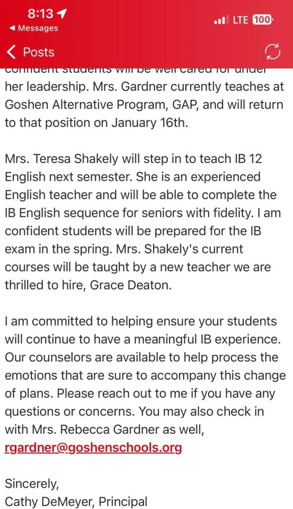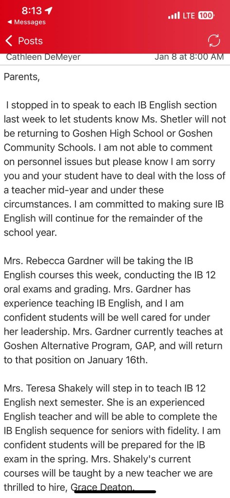 “I stopped in to speak to each IB English section last week to let students know Ms. Shetler will not be returning to Goshen High School or Goshen Community Schools.” Principal Cathleen DeMeyer wrote. “I am not able to comment on personnel issues but please know I am sorry you and your student have to deal with the loss of a teacher mid-year and under these circumstances… Our counselors are available to help process the emotions that are sure to accompany this change of plans.”