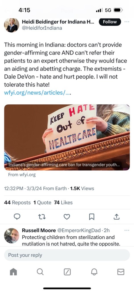 “This morning in Indiana: doctors can’t provide gender-affirming care AND can’t refer their patients to an expert otherwise they would face an aiding and abetting charge. The extremists – Dale DeVon – hate and hurt people. I will not tolerate this hate.” Beidinger wrote in her post.