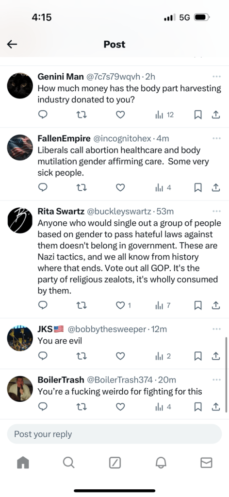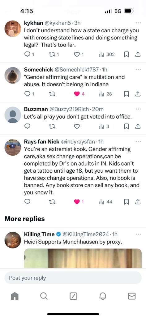 “You’re an extremist kook. Gender affirming care, aka sex change operations, can be completed by Dr’s on adults in IN. Kids can’t get a tattoo until age 18, but you want them to have sex change operations. Also, no book is banned. Any book store car sell any book, and you know it.” Another user added.