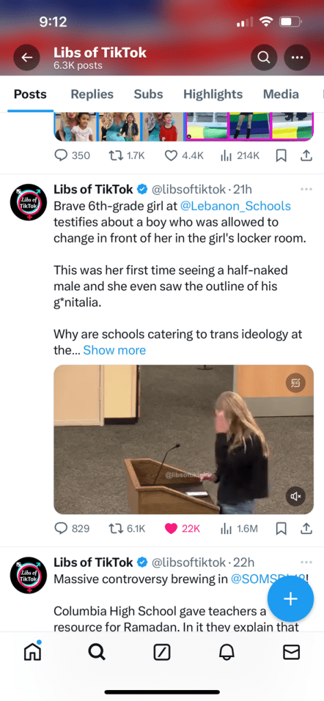 The first story Libs of TikTok shared involved video of a school board meeting in Lebanon, Indiana, showing an 11-year-old 6th grade girl discussing how a boy was using the girls’ locker room. As of 9:00am on Thursday, the story had been viewed 1.6 million times on Raichik’s page.