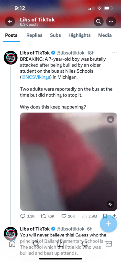 Three hours after pushing the first REAL News story, Libs of TikTok posted about another RNM investigation into an incident in Niles, Michigan, involving a 7-year-old Ballard Elementary School boy who was viciously beaten by a much older child on the school bus. As of 9:00am on Thursday, that story had been viewed by 2.9 million people on Raichik’s page.