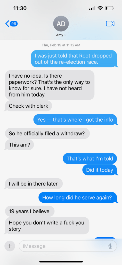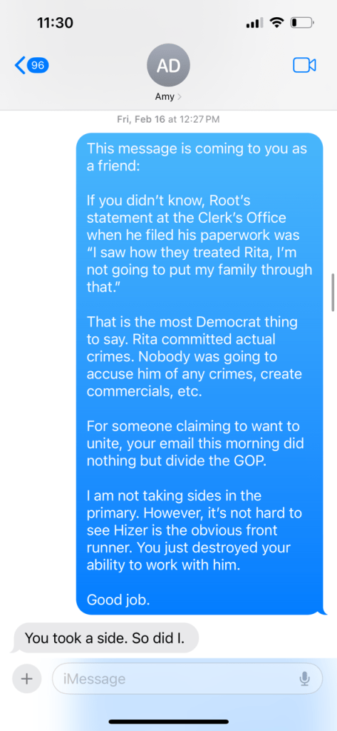 Me: “This message is coming to you as a friend: If you didn’t know, Root’s statement at the Clerk’s Office when he filed his paperwork (to withdraw) was ‘I saw how they treated Rita (Glenn), I’m not going to put my family through that.’ That is the most Democrat thing to say. Rita committed actual crimes. Nobody was going to accuse him of any crimes, create commercials, etc. For someone claiming to want to unite, your email this morning did nothing but divide the GOP. I’m not taking sides in the primary. However, it’s not hard to see Hizer is the obvious front runner. You just destroyed your ability to work with him. Good Job.”