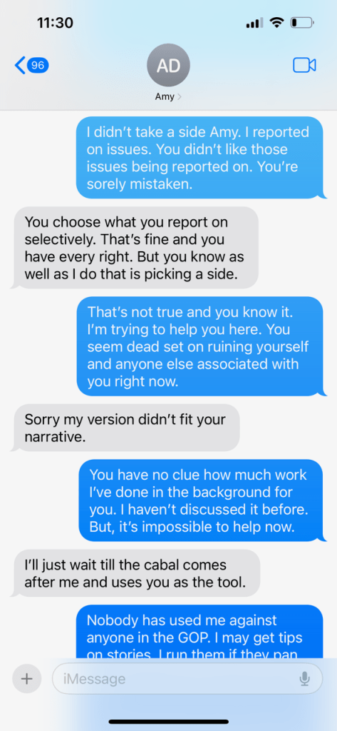 Me: “I didn’t take a side Amy. I reported on issues. You didn’t like those issues being reported on. You’re sorely mistaken.”