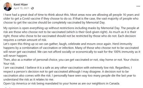 Drake has claimed Hizer is unfit for office because he and his wife never had children. She claims he supported COVID masking and vaccination mandates, which are completely rebuked by a statement made by Hizer in 2021 as seen below — the truth is, Hizer worked with a federal task force to build overflow field hospitals during Covid. Drake has also attacked Hizer because he liked a post made by the former St. Joseph County GOP Chair and current Penn Harris Madison School Board President Chris Riley years ago. What’s dishonest about this is Drake never attacked the late Congresswoman Jackie Walorski for her open support of Chris Riley or the fact that Walorski never had children herself either.