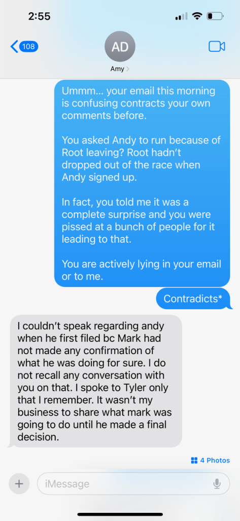 Me: “Ummm… your email this morning is confusing and contradicts your own comments before. You asked Andy to run because of Root leaving? Root hadn’t dropped out of the race when Andy signed up. In fact, you told me it was a complete surprise and you were pissed at a bunch of people for it leading to that. You are actively lying in your email to me.”