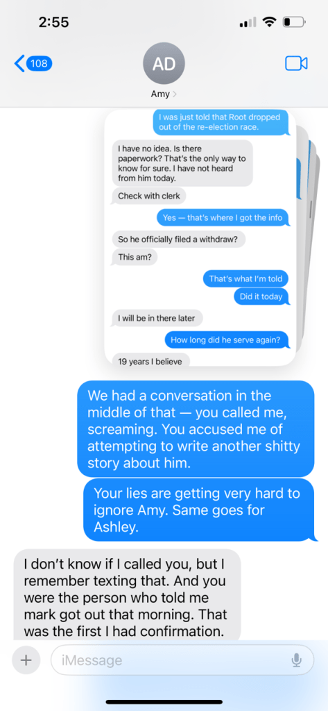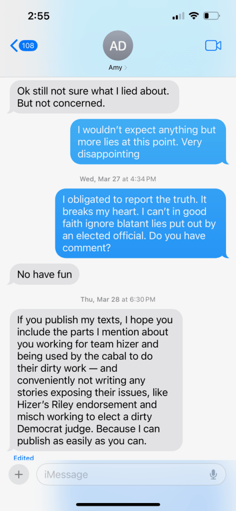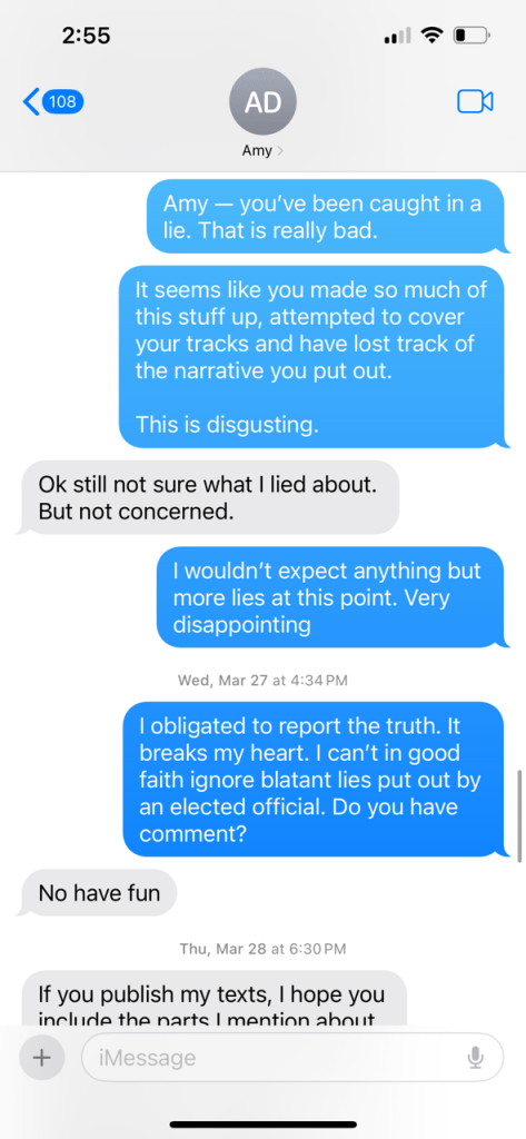 Me: (I sent her several screenshots of our conversation for reference) “We had a conversation in the middle of that — you called me screaming. You accused me of attempting to write another shitty story about him. Your lies are getting very hard to ignore Amy. Same goes for Ashley (the head of a conservative schools group in the Michiana area).