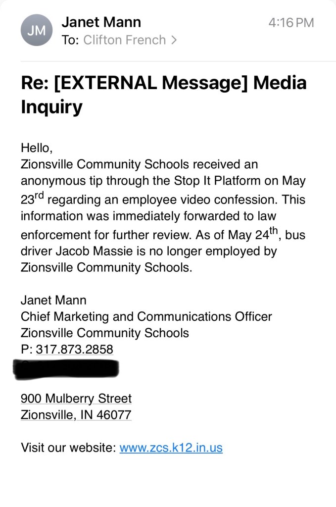 “Zionsville Community Schools received an anonymous tip through the Stop It Platform on May 23rd regarding an employee video confession.” Janet Mann, Zionsville Schools Chief Marketing and Communications Officer, wrote in an email. “This information was immediately forwarded to law enforcement for further review. As of May 24th, bus driver Jacob Massie is not longer employed by Zionsville Community Schools.”