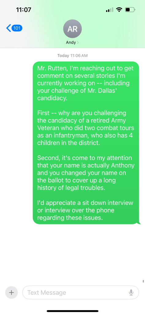 RNM reached out to Rutten for comment. We left him a voicemail and sent him a text on Sunday morning. He did not respond. A screenshot of the text message can be seen below.
