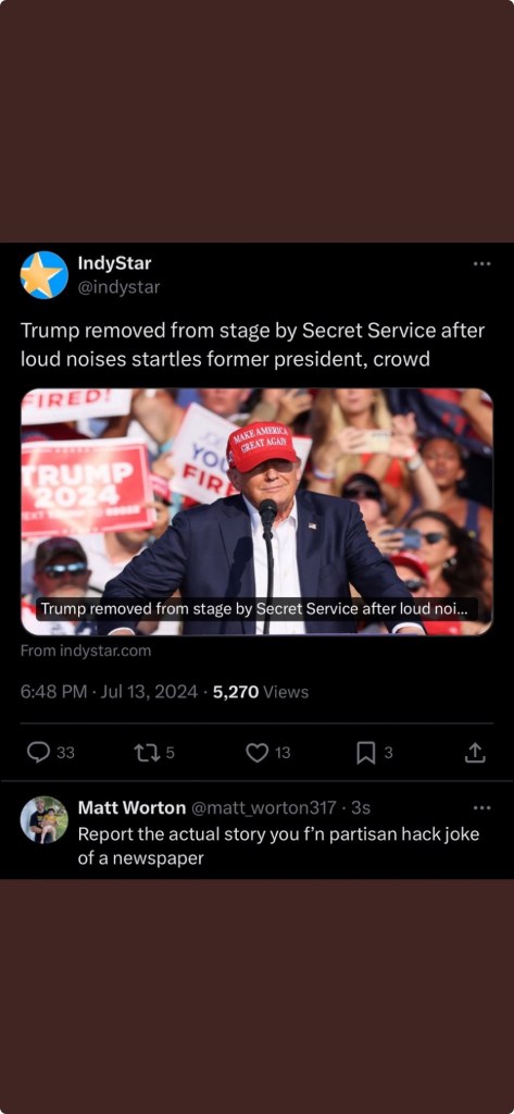 The Indianapolis Star received widespread condemnation for its reporting on the events. Hours after it was evident someone attempted to kill President Trump, an Indianapolis Star headline and social media posts stated “Trump removed from stage by Secret Service after loud noises startles former president, crowd.”
