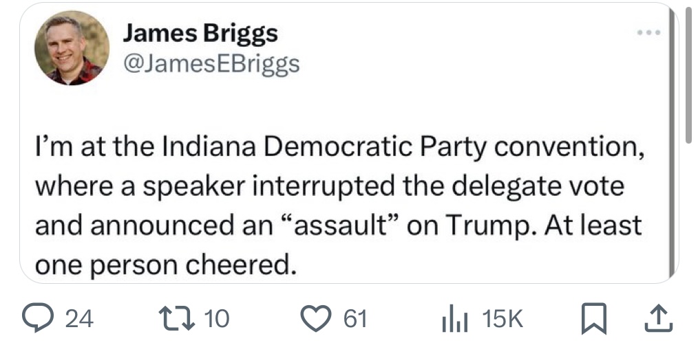“I’m at the Indiana Democratic Party convention where a speaker interrupted the delegate vote and announced an “assault” on Trump. At least one person cheered.” James Briggs, a columnist for the Indianapolis Star, wrote on X.