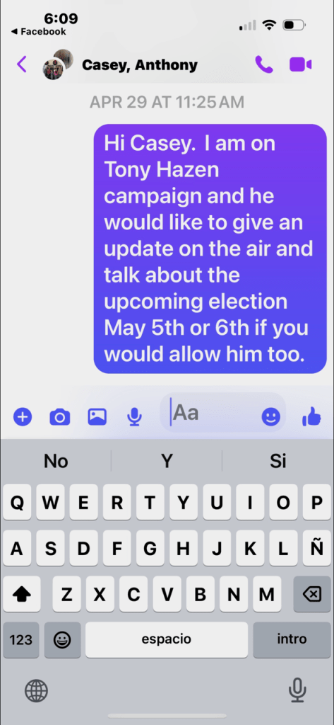 During the same primary season, Hendrickson refused to interview County Commissioner Tony Hazen. Text messages between Hendrickson and Hazen’s campaign manager can be seen below. Hazen’s opponent was being supported by Leader and Drake.