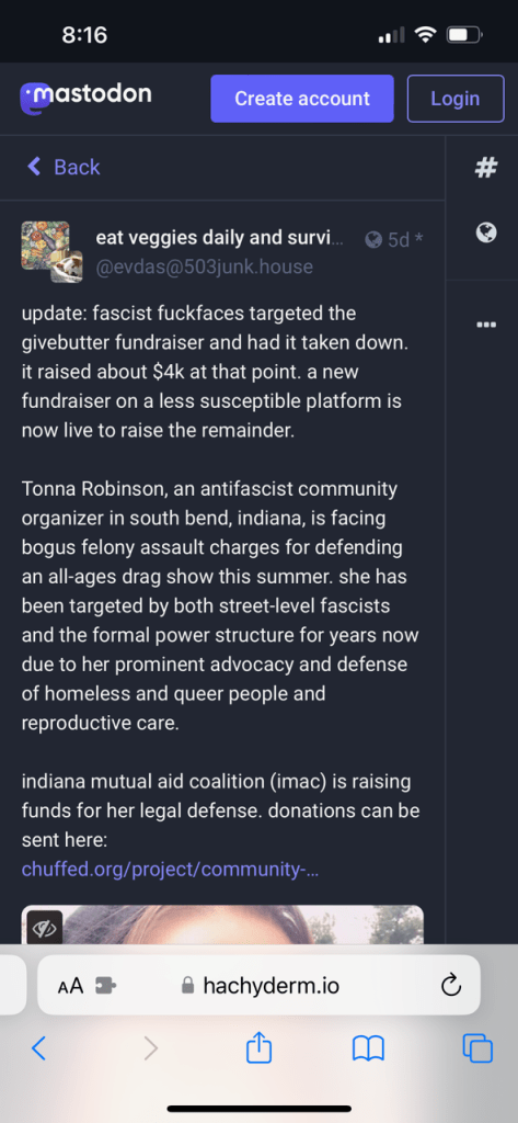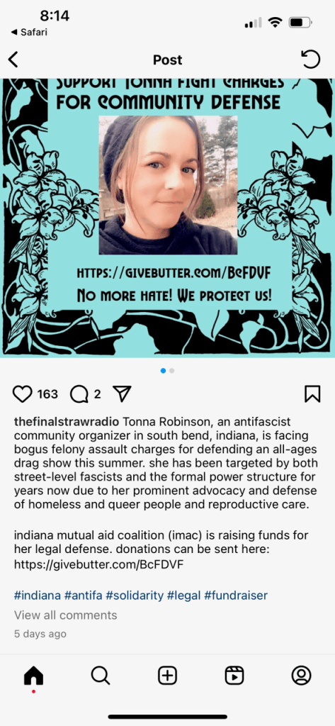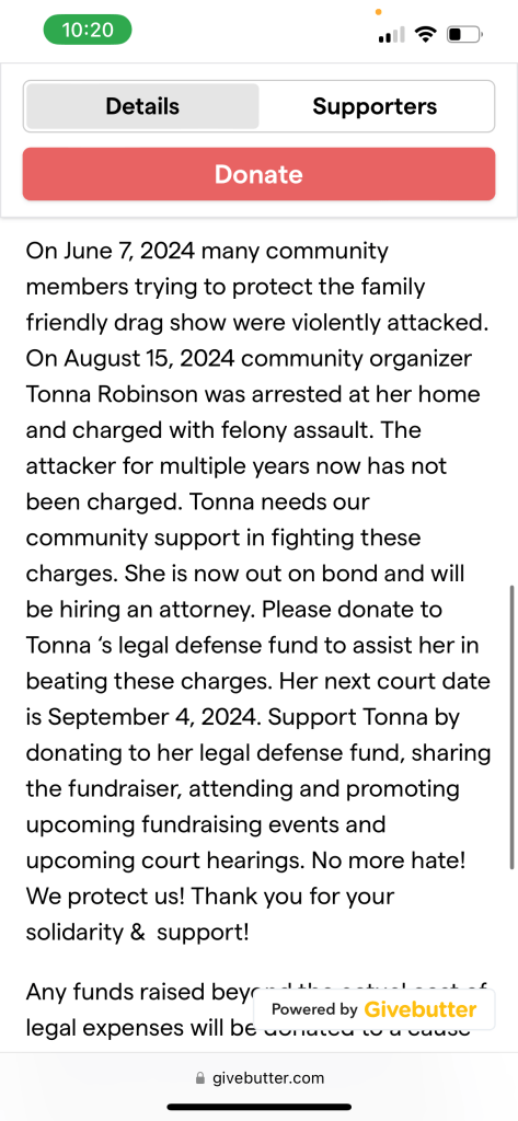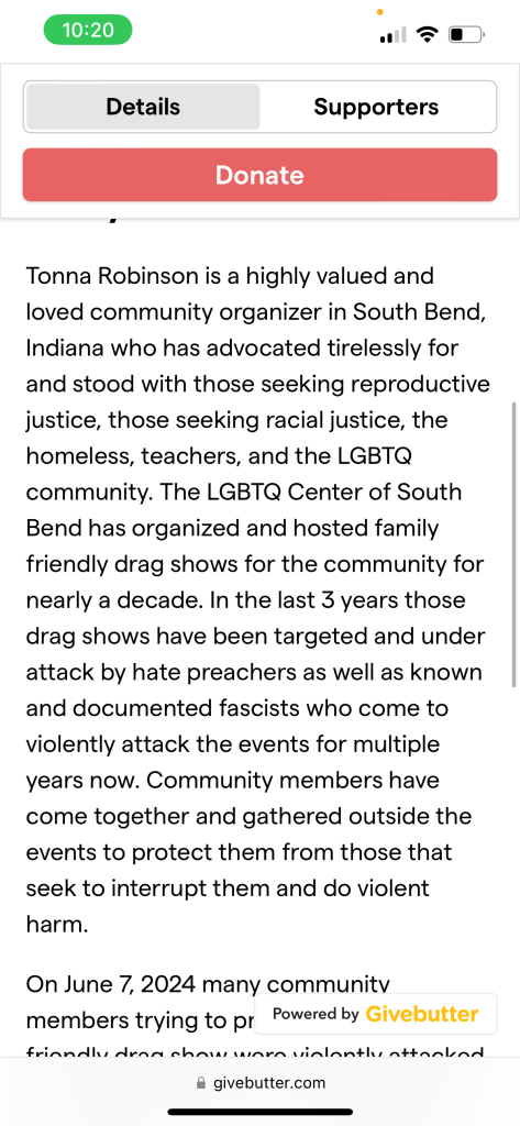 Robinson is currently being charged with a felony Battery Resulting in Serious Bodily Injury for hitting a man in the head with a large brass bell while she was “pulling security” outside of a drag show for kids in South Bend on June 7th. Most of these fundraising sites have policies against raising money for violent crimes. All of them have policies against misinformation being presented in order to solicit funds.