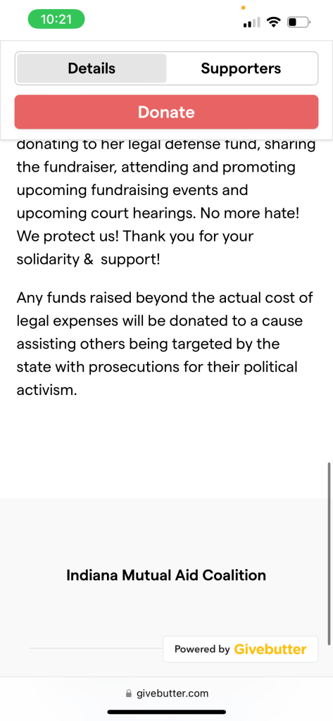 The fundraisers have all been created and pushed by the Indiana Mutual Aid Coalition, which is seeking $20,000 for her legal fees. The campaigns were then been shared by the Northern Indiana Democrat Socialists of America, a self-described Satanist who is the Assistant State Director of the Kentucky American Atheists and several self-described members of Antifa across the country. One fundraiser was showing approximately $4,000 in donations before it was disabled by the company Givebutter.com.