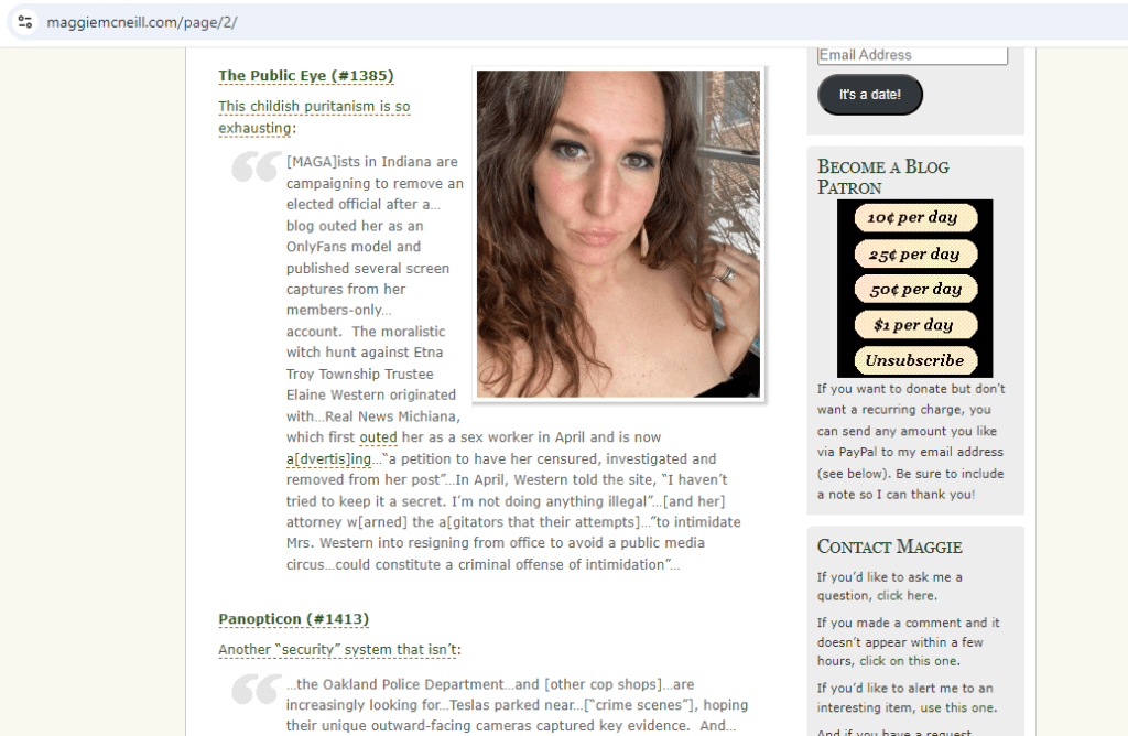 Western was first elected as the Etna Troy Township Trustee in 2018. She was reelected to the position in 2022. It turns out, she started her pornographic ventures on Onlyfans on October 21st of 2022, less than three weeks before her 2022 general election victory in which she ran unopposed. She is still active on the site and was in fact seen on the porngraphic page approximately three hours before the publication of this story.