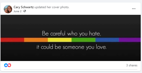 Carmel Clay Schools Counselor Cary Schwartz obviously advocates for pushing LGBTQ ideolgy onto children. Multiple posts on her social media accounts show her advocacy, however, she seems to be careful about limiting any extreme radical stances “publicly” as her Facebook page is semi-private and her X (formerly known as Twitter) account is set to “protected.”