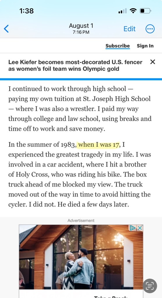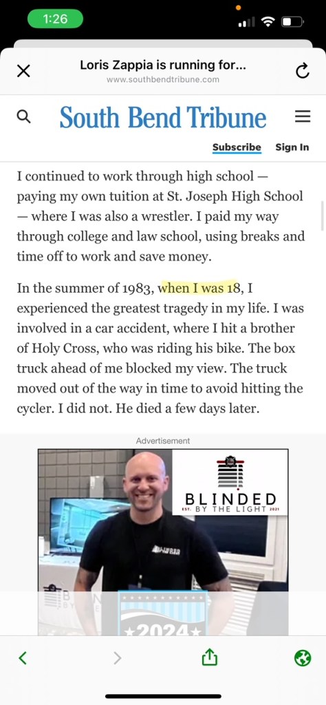 For nearly 40 years, Loris Zappia has claimed he was a minor when he was involved in a fatal car vs. bicycle crash. It turns out, at the time of the crash, Zappia was in fact 18-years-old. This may seem like a minor oversight, however, records involving minors are not publicly available and the lie about his age appears to have been devised to prevent anyone from looking into the circumstances regarding the case. While Zappia has historically has told people (including RNM’s Clifton French in January of this year) that he was 16-years-old when he hit and killed 55-year-old Basil Thomas, in a “Viewpoint” published on May 22nd in the South Bend Tribune, Zappia claimed he was 17-years-old when he hit and killed the bicyclist. A screenshot taken On August 1st shows the original text of the story.