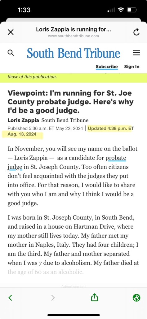 SOUTH BEND, Ind. — REAL News Michiana has discovered the South Bend Tribune secretly edited an op-ed months after publication in an apparent attempt to cover up a lie by Probate Judge Candidate Loris Zappia. The stealth edit came only days after a REAL News investigation detailed the lie and used the Tribune’s story as evidence. Despite making changes to the story, nowhere in the updated version did the South Bend Tribune notate any changes had been made.