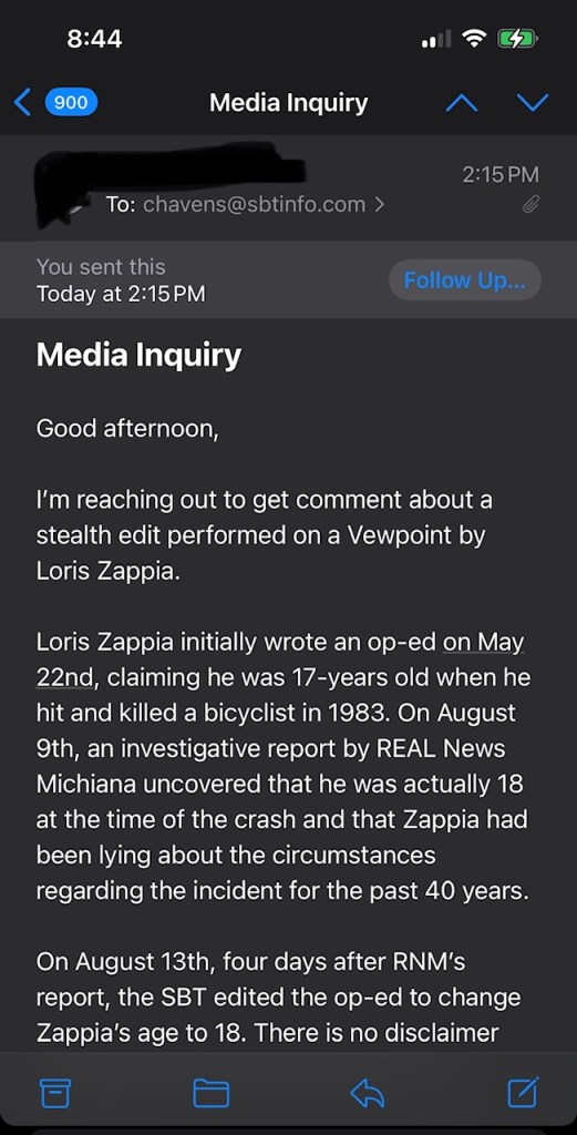RNM reached out to South Bend Tribune Editor Cory Havens for comment on the stealth edit. A copy of that email can be seen below. Havens has not responded.