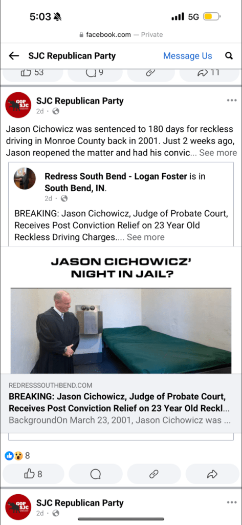 For weeks, the St. Joseph County GOP has been taking to social media to share multiple stories from the website “Redress South Bend”, a blog which was started by a man named Logan Foster in an attempt to skirt a no-trespass order he received for harassing and stalking South Bend City staff. While the website has recently been critical of a few Democrats within the County, everything the GOP shares from Redress South Bend includes a massive pop-up banner of a fundraiser for the legal fees of former South Bend Common Council Member Henry Davis Jr. The fundraiser was started by Redress South Bend’s owner, Logan Foster.