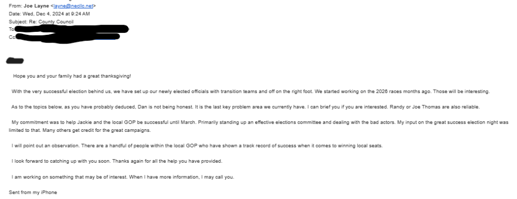 “Dan is not being honest. (He) is the last key problem area we currently have.” Layne wrote in his email, “My commitment was to help (GOP Chair) Jackie (Horvath) and the local GOP be successful until March. Primarily standing up an effective elections committee and dealing with the bad actors.”