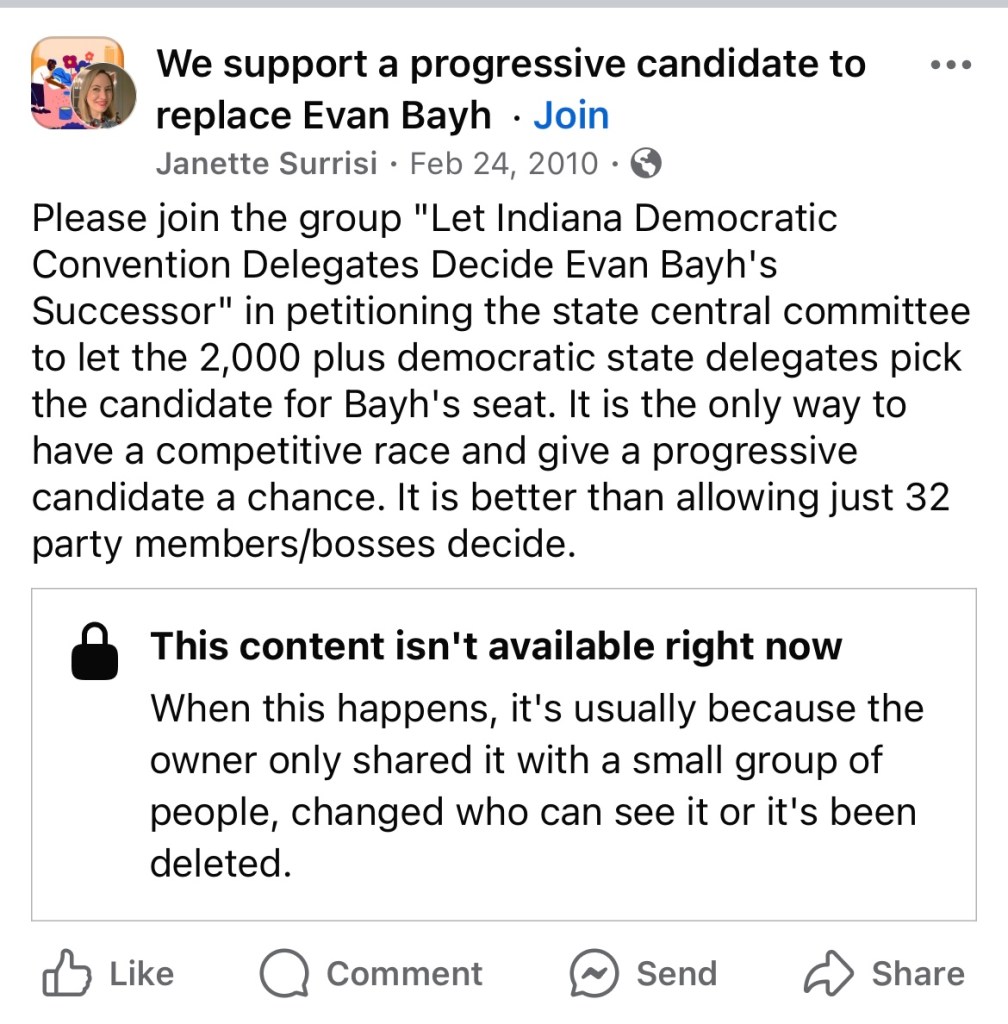 In that group, she helped lead efforts to push for a more left-wing successor to Bayh, who was once considered as Barack Obama’s potential vice-presidential pick. She wrote, “It is the only way to have a competitive race and give a progressive candidate a chance. It is better than allowing just 32 party members/bosses to decide.”