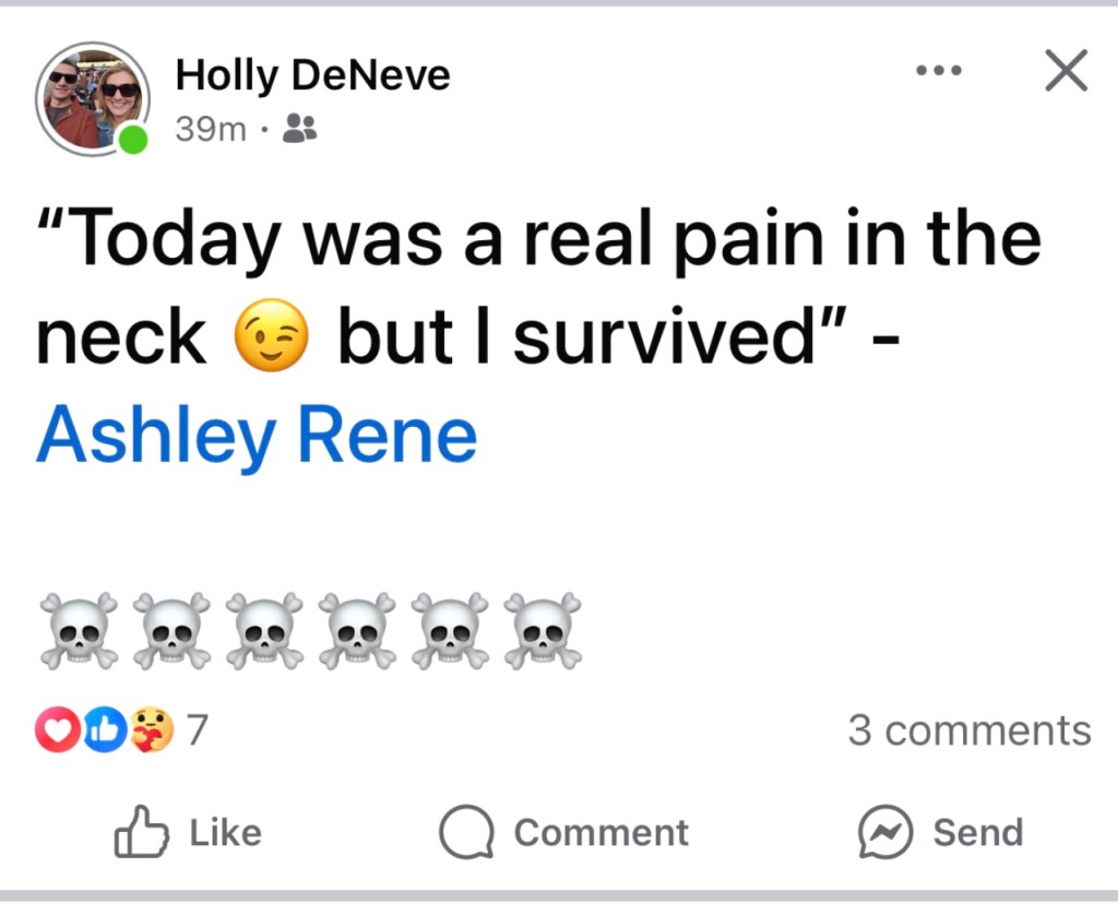 DeNeve, who goes by the name “Holly De” on Facebook, posted the following shortly after Kirk was shot and killed during a speaking event at Utah Valley University on Wednesday: “Today was a real pain in the neck but I survived”. DeNeve wrote on Facebook along with several emojis, including six skull and crossbones and a winking face.