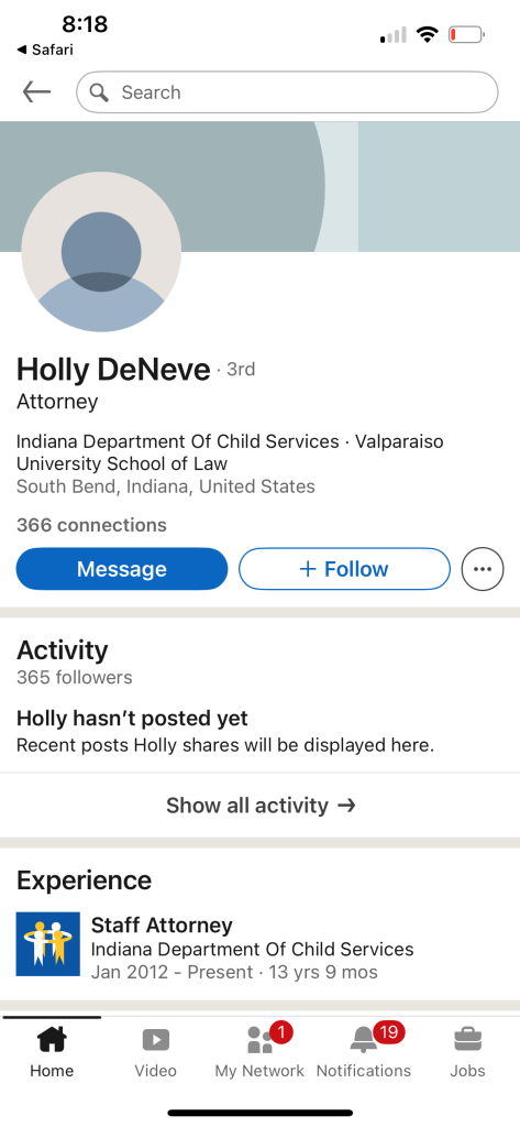 Several sources confirmed to RNM that DeNeve, who lives in South Bend, is a Staff Attorney for the Indiana Department of Child Services. According to her LinkedIn profile, DeNeve has worked for the Indiana Department of Child Services for nearly 14 years. RNM reached out to the Indiana DCS for comment. Within 30 minutes of our email to DCS, DeNeve deleted or made private nearly all of her social media accounts.